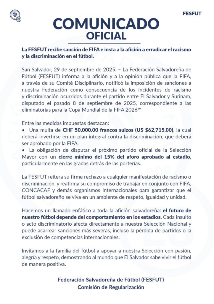 Por medio de un comunicado, la FESFUT informó sobre la sanción recibida por parte de la FIFA, por los actos racistas durante el partido entre El Salvador y Surinam.
